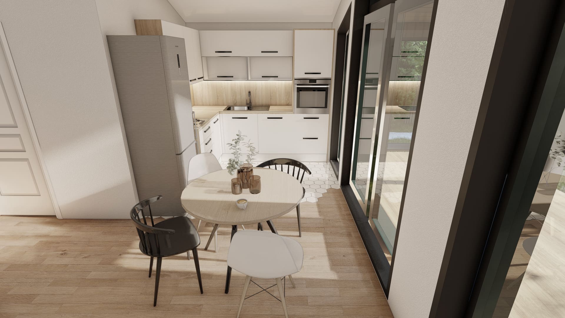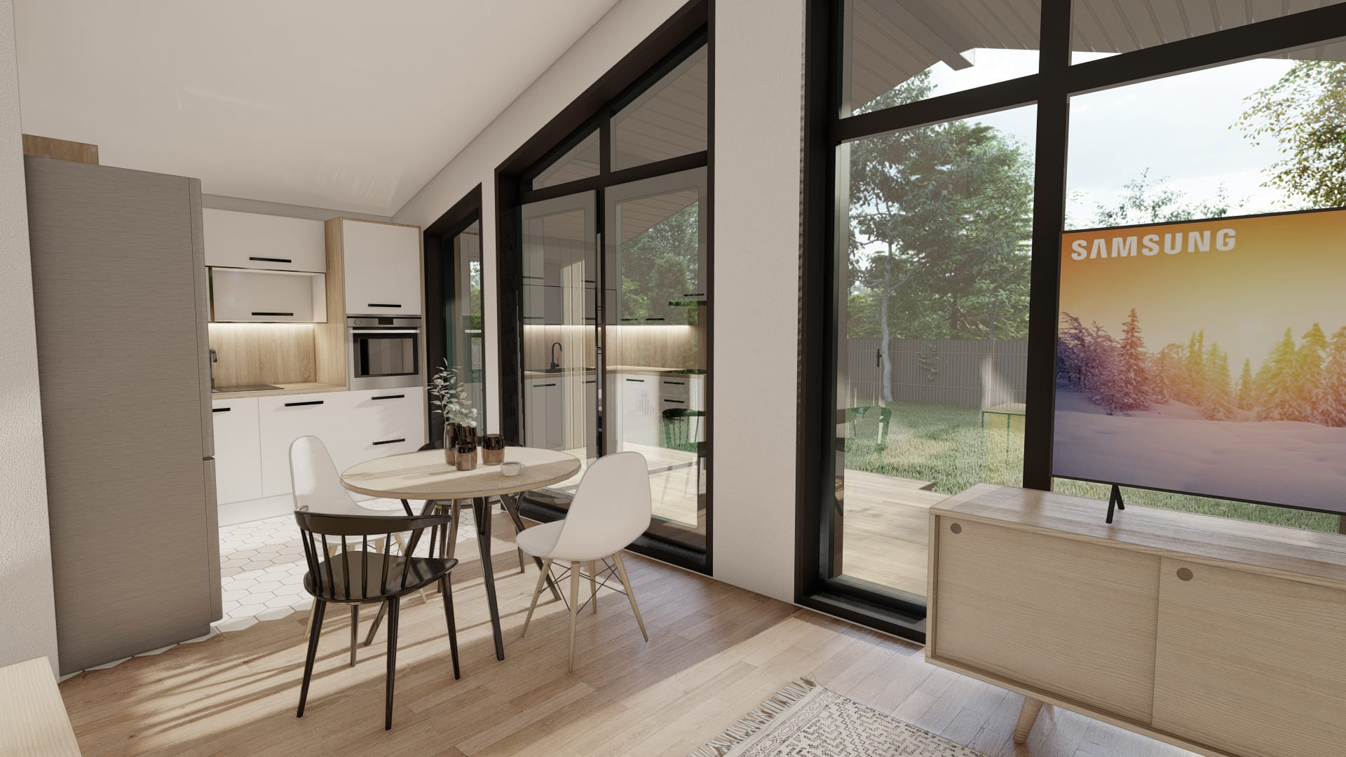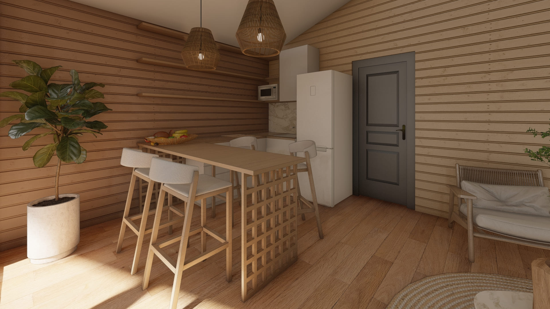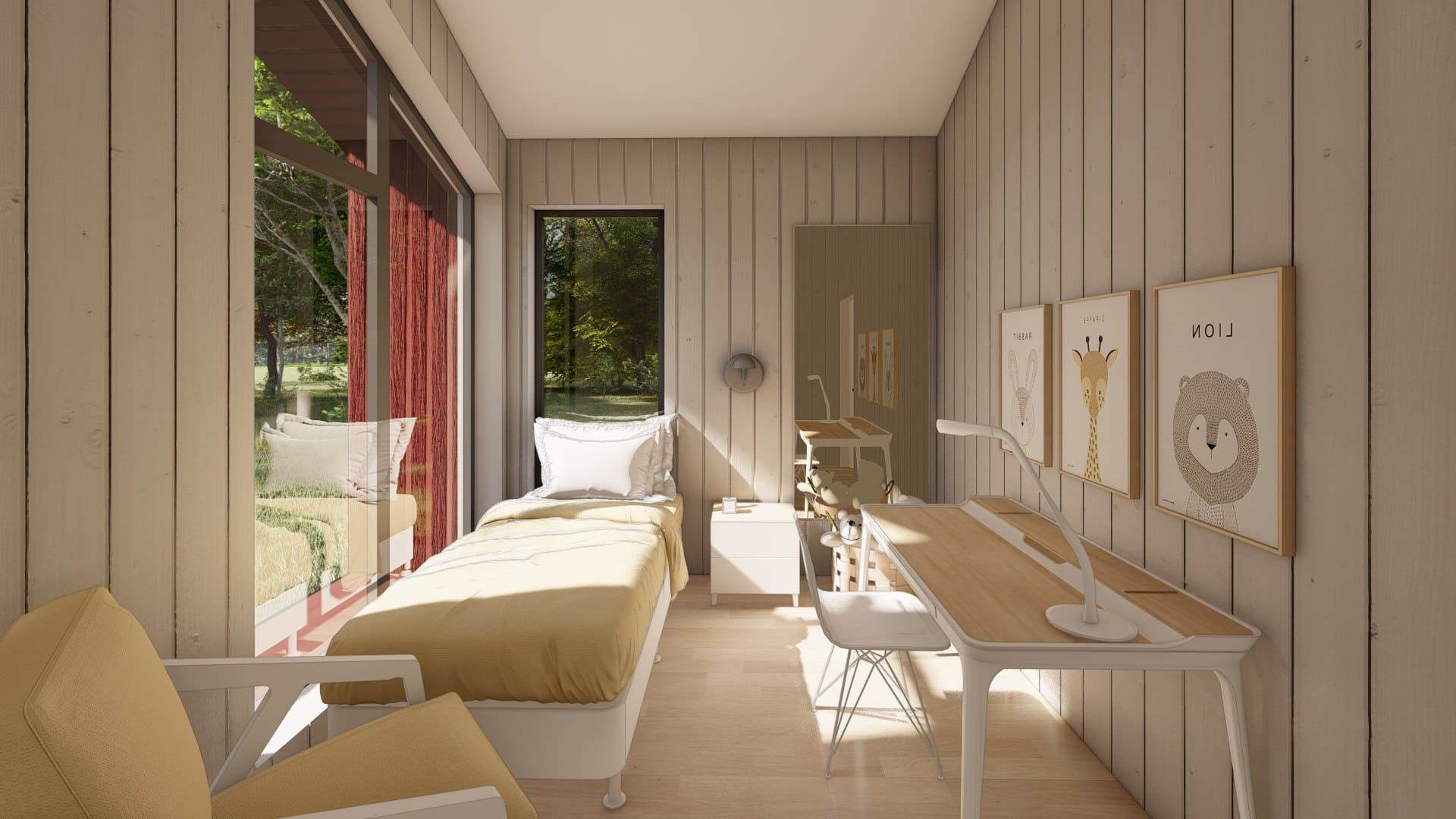 Уютный и просторный дом, для семьи 3-4 человека. В доме есть кухня-гостиная, 2 спальни, 1 санузел и терраса.