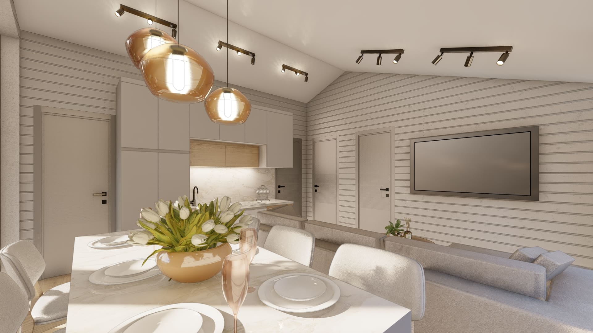 Уютный 1-этажный барнхаус с общей площадью 100 м2, станет домом мечты для большой семьи. Потолки: 2,5 – 4,2 м. В данном проекте мы гармонично устроили: просторную кухню-гостиную с отдельной обеденной зоной с выходом на просторную террасу, 3 спальные комнаты, мастер-спальня размещена отдельно, санузел, гардеробную и котельную. Данное решение предусмотрено для круглогодичного проживания семьи.